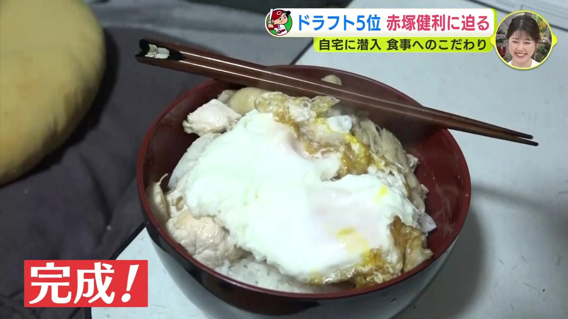 赤塚投手がこの日、作ったのは、オリジナルの丼メシ。まずは鶏むね肉を200グラム。そしてエノキもカットし、白ご飯は1.5合を準備。炒めた鶏むね肉とエノキをご飯の上に乗せると、次は卵も焼き始めます。この日はタンパク質が少なかったということで卵を2つ投入。