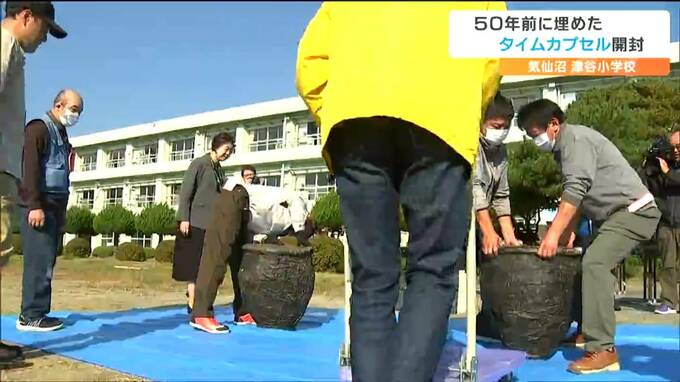 気仙沼市本吉町にある津谷小学校には3日、卒業生などおよそ200人が集まりました。そして開校100周年を記念して50年前に埋めていた陶器製のカプセル2個を開封しました。
