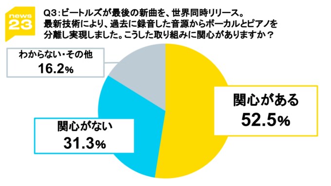 ▽ビートルズが最後の新曲をリリースするにあたって最新技術を使うなどした取り組みについて、約半数が【関心がある】と答えました。一方、【関心がない】は約3割となりました。