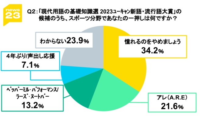 ▽2日発表された「現代用語の基礎知識選 2023ユーキャン新語・流行語大賞」の候補のうち、スポーツ分野の一押しを聞いたところ、【憧れるのをやめましょう】が3割を超え、最も多くなりました。次いで【アレ(A.R.E)】が続きました。