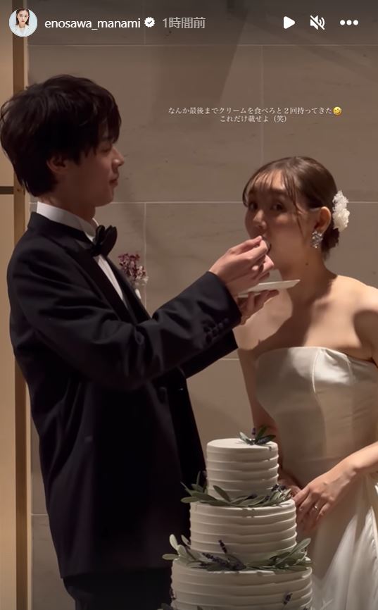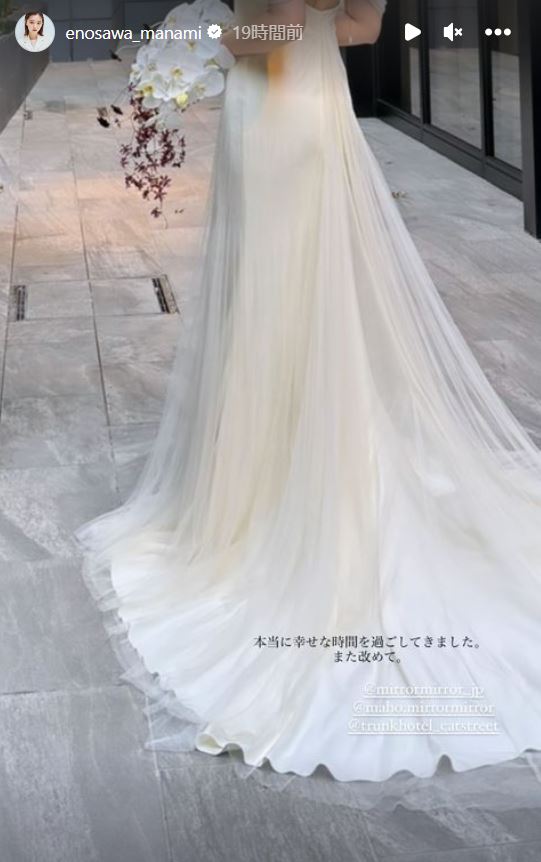 江野沢さんはストーリーズに、自らのウェディングドレスの写真とともに「本当に幸せな時間を過ごしてきました」と投稿。続いて、江野沢さん夫婦と思われるウェディングドレスの女性とタキシードの男性が寄り添うモノクロの写真を投稿しています。