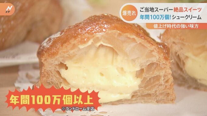 独特な食感のヒミツは、パイ生地。グラニュー糖をまぶして高温で一気に焼き上げる!“こんがりとした焼き色”に“香ばしい甘さ”、そして“サクサクな食感”が三位一体となった究極のシュー生地。甘さ控えめのカスタードクリームと相性抜群なんです。多い時で、1日800個も売れるそうですが・・・