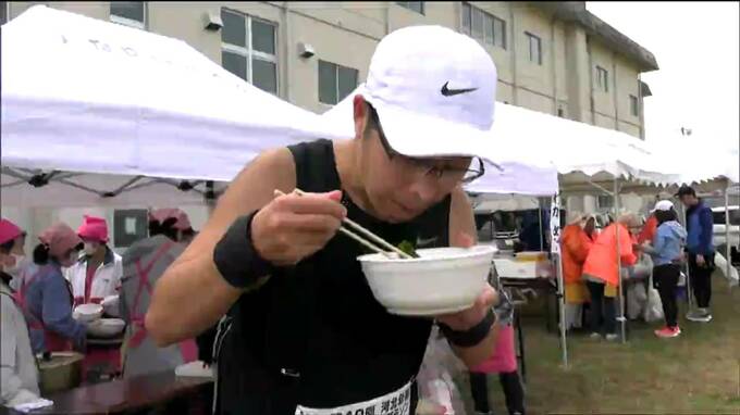 ゴールした後にはワカメ汁やマグロの兜焼きが振る舞われランナーたちは大島の自然を満喫していました。
