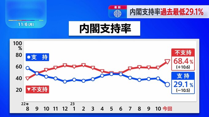 岸田内閣の支持率が総理就任後、初めて30%を切り、過去最低となったことが最新のJNNの世論調査でわかりました。調査はこの土日にご覧の方法で行いました。岸田内閣を支持できるという人は、前回の調査から10.5ポイ…