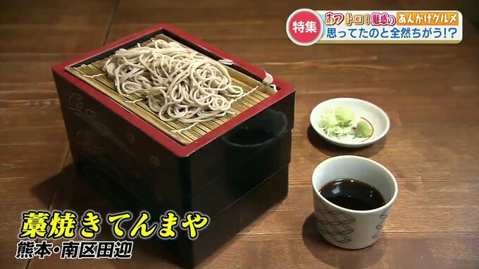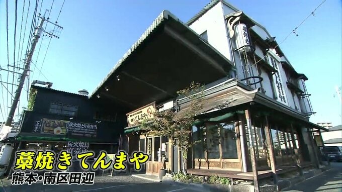 まずは、熊本市南区田迎の『藁焼き てんまや』。豪快な藁焼き料理がウリの店で、昼は十割そばも人気です。