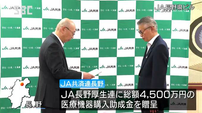 長野市で行われた贈呈式では、JA共済連長野の米久保隆(よねくぼたかし)本部長から県内各地で病院を運営するJA長野厚生連に、総額4,500万円余りの目録が手渡されました。