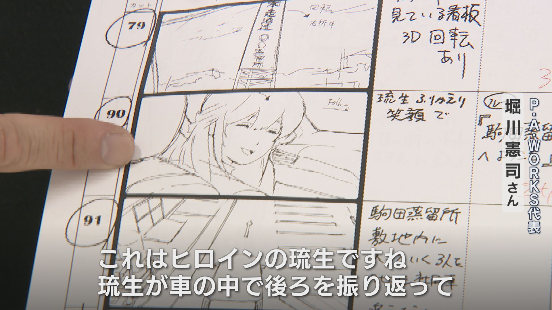 P.A.WORKS代表・堀川憲司さん:「ばれちゃわないかな…。例えば絵コンテのカット90。これはヒロインの琉生ですね。琉生が車の中で後ろを振り返って、『駒田蒸留所へようこそ』というセリフをいうのがこのカット内容ですね。」
