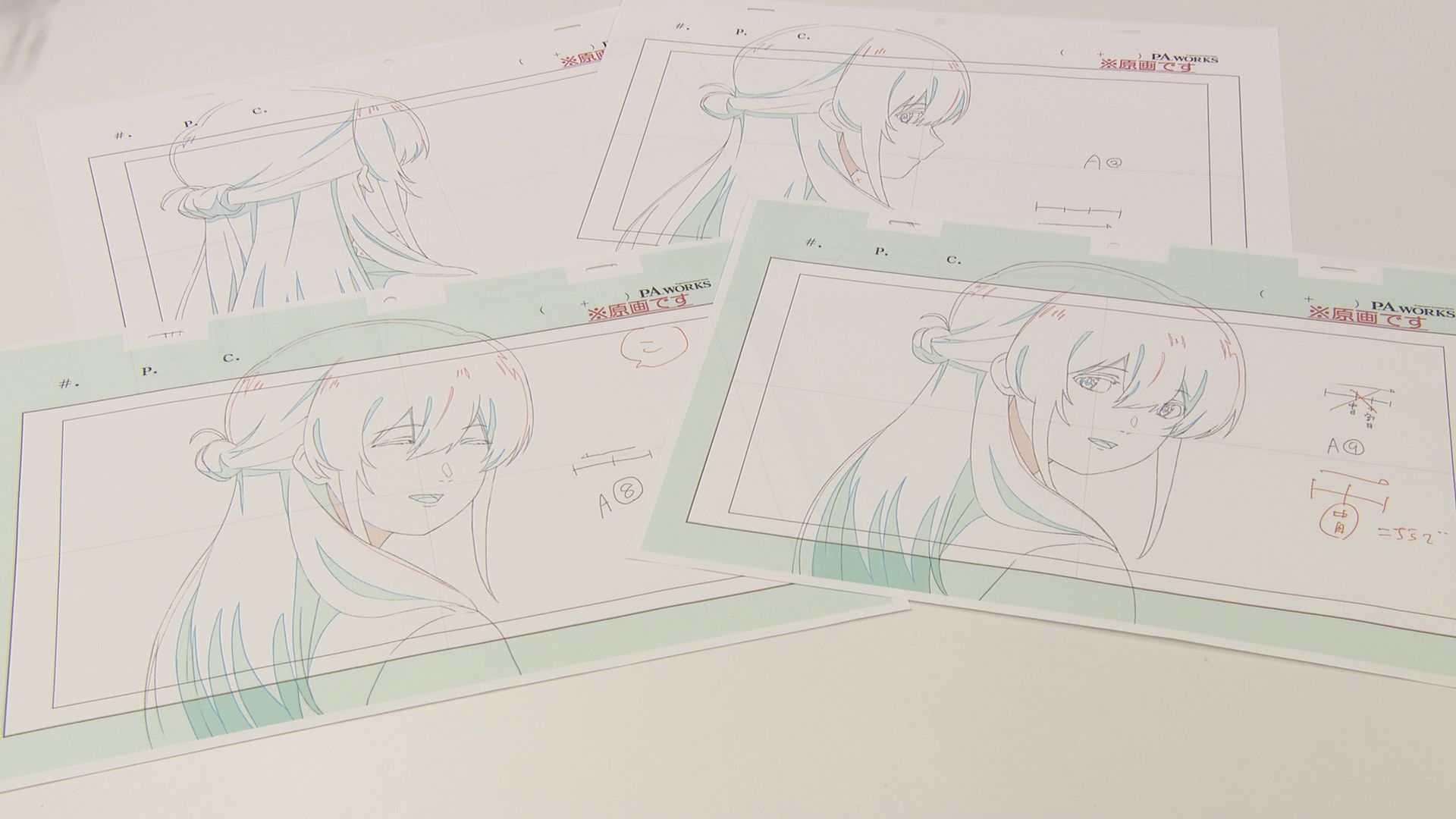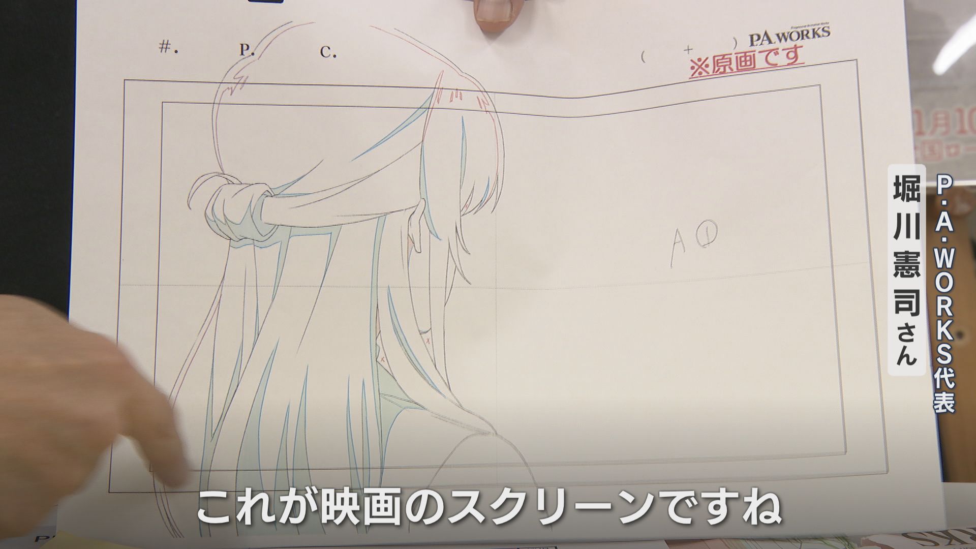 P.A.WORKS代表・堀川憲司さん:「これが映画のスクリーン。このスクリーンに対して(琉生が)向こうをみていますよ、振り返ってセリフを言いますよ、というイラスト。振り返るだけで、これだけたくさんの絵を描きます。」
