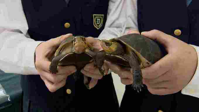 高校生たちは、宮古島市の職員から2匹のカメを受け取りました。