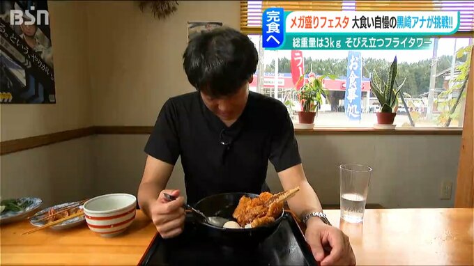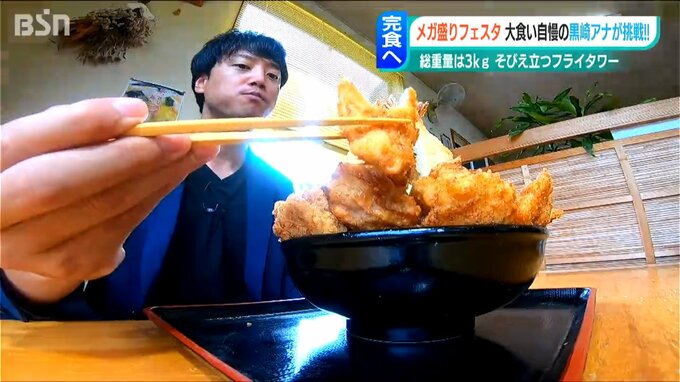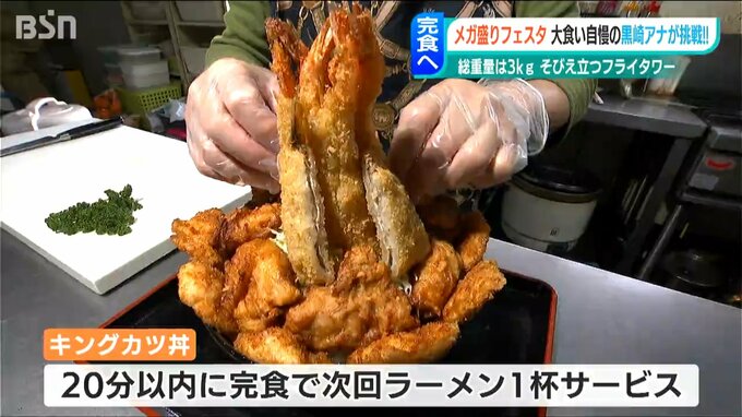 ちなみに20分以内で完食できれば、次回の来店時、ラーメンが1杯サービスになります。チャレンジしたのはBSN新潟放送で“一番の大食漢”黒崎貴之キャスター。この“大盛りのキング”に負けていられません。