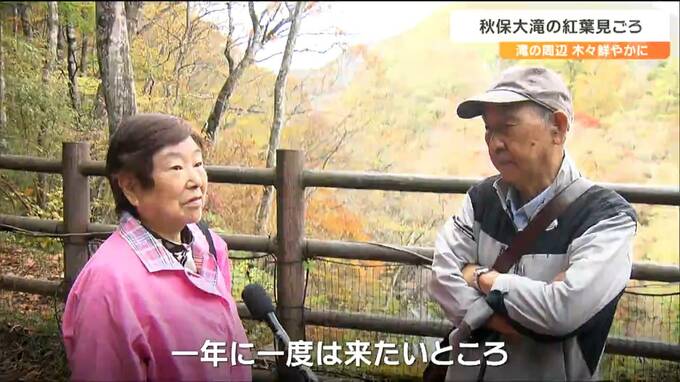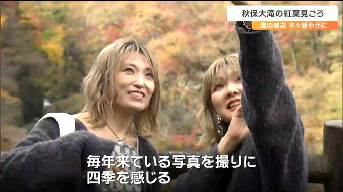 宮城県内では紅葉が見頃を迎えています。仙台市太白区の秋保大滝もその一つで、流れ落ちる滝の周囲で木々が鮮やかに色づいています。