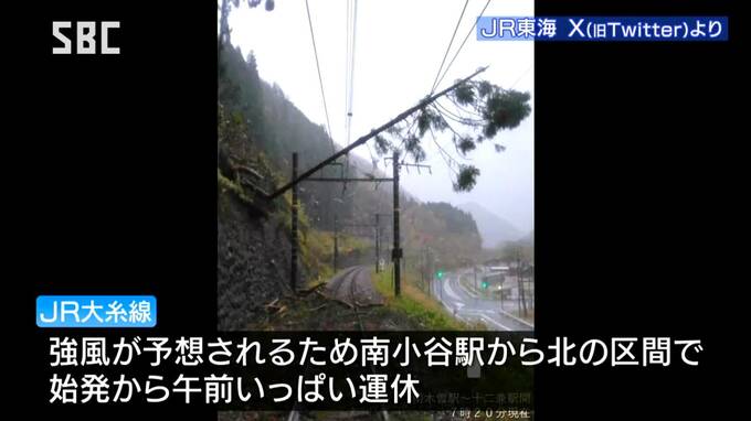 JR中央西線では、南木曽町で倒木があり、南木曽駅と上松駅の間の上下線で始発から午前11時半ごろまで運転を見合わせ、特急しなのは、午前10時発の列車まで運休しました。
