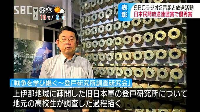 優れた番組や放送活動に贈られる日本民間放送連盟賞で、SBCラジオの2つの番組などが優秀賞に選ばれました。表彰式は7日、東京で行われ、「ラジオ報道」部門で「SBCラジオスペシャル戦争を学び継ぐ~登戸研究所調査…