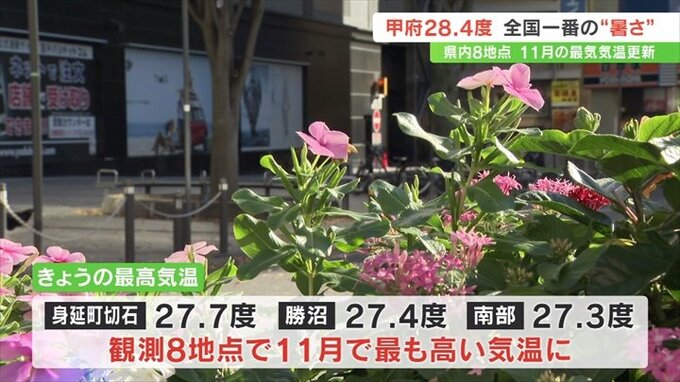 7日は身延町切石で27.7度、勝沼で27.4度などと県内10の観測地点のうち、8地点で11月の観測史上最も高い気温となりました。