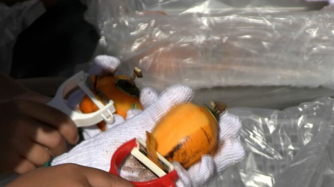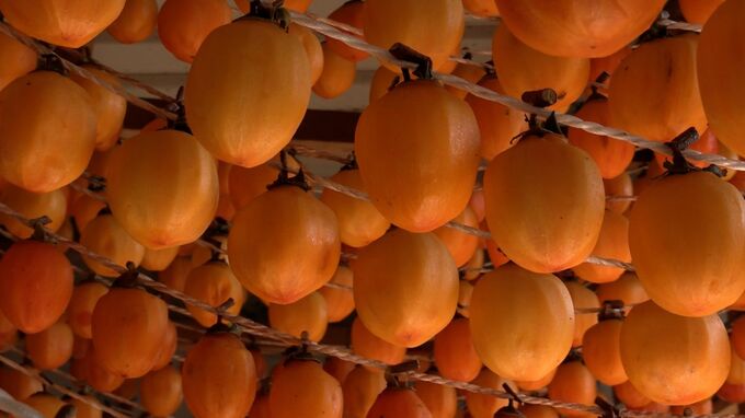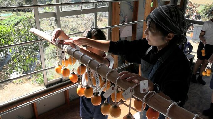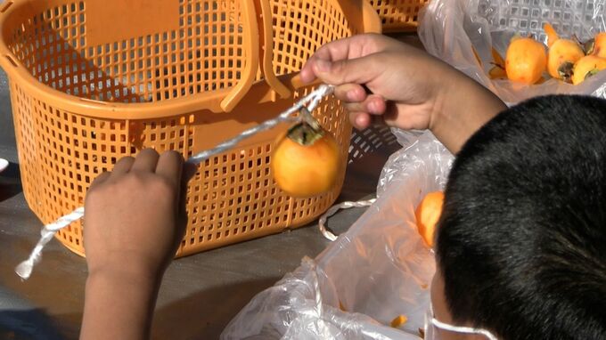 児童らが作業をした柿は約40日間干すことで柔らかくて美しい色になり、上品な甘さに仕上がるということです。