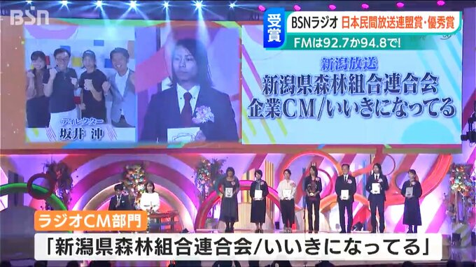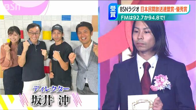また、ラジオCM部門でもBSNが制作した20秒CMが優秀賞を受賞しました。BSNラジオはAM放送だけでなくFM92.7、FM94.8でもクリアな音質でお届けしています。