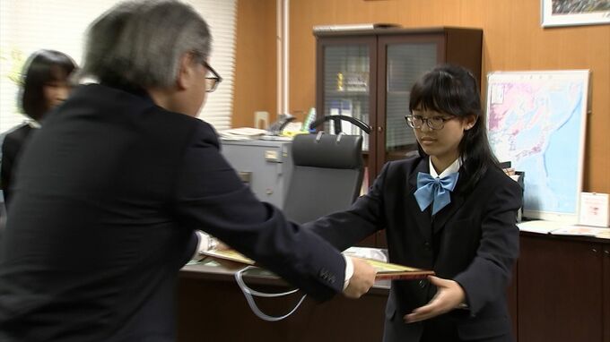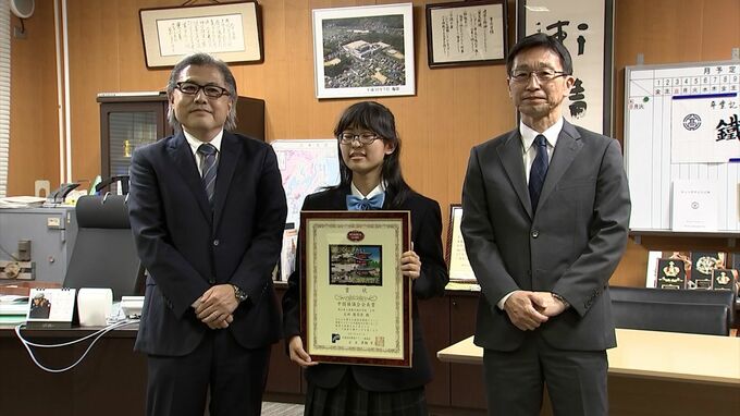 倉敷天城中学校で開かれた表彰式では、コンクールで入賞した太田優羽奈さんに賞状が授与されました。