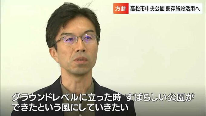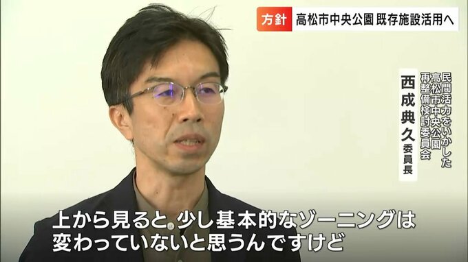 (民間活力をいかした高松市中央公園再整備検討委員会 西成典久委員長・香川大経済学部教授)「上から見るとですね、少し基本的なゾーニングは変わってないと思うんですけど、中低木を除いたりとか、そうすると非常に光が入ってきて
