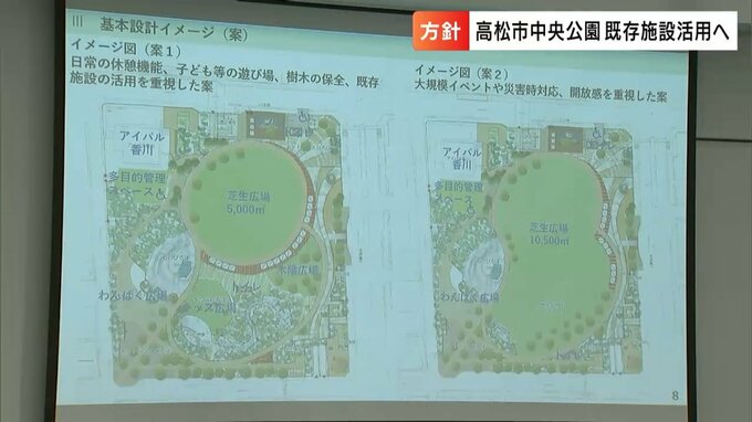 きょう(7日)開かれた公園の再整備を検討する委員会では、基本設計のイメージ図、2つの案が示されました。既存の施設を活用した案と、大規模イベントを想定し芝生広場を1万平方メートルに広げた案です。