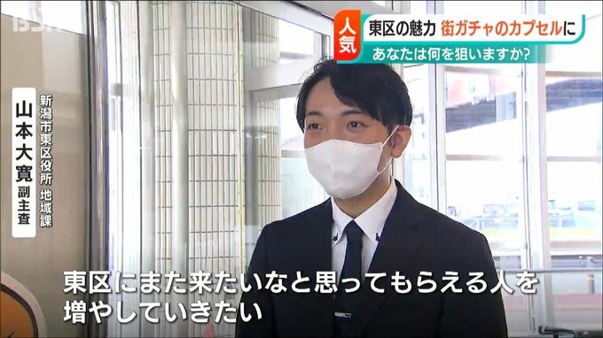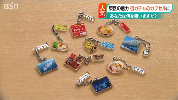 区役所に設置された街ガチャには、東区にある工場や新潟空港のほか、馴染みの食品などとコラボした、全部で9種類のキーホルダーが入っています。