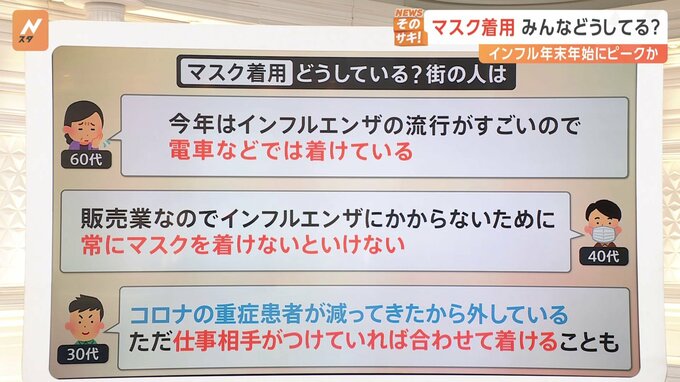「今年はインフルエンザの流行がすごいので、電車などでは着けている」