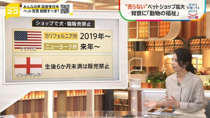 フランスのケースを紹介しましたが、アメリカ・カリフォルニア州では2019年から禁止、ニューヨーク州では2024年からショップでの犬・猫の販売を原則禁止します。イングランドの場合、生後6か月未満は原則販売禁止となっています。