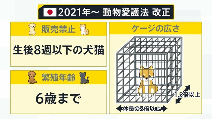 日本も何もやってないというわけではなくて、動物愛護法が改正(2021年施行)されました。今は生後8週以下の犬猫は販売禁止となっていて、繁殖も6歳までと制限を設けました。