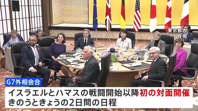 G7=主要7か国の外相会合がきのうから東京都内で始まり、イスラエル・パレスチナ情勢について議論が交わされました。上川陽子外務大臣「事態が刻一刻と動き、緊張が日増しに高まる中、また世界の分断が深まる中で、…