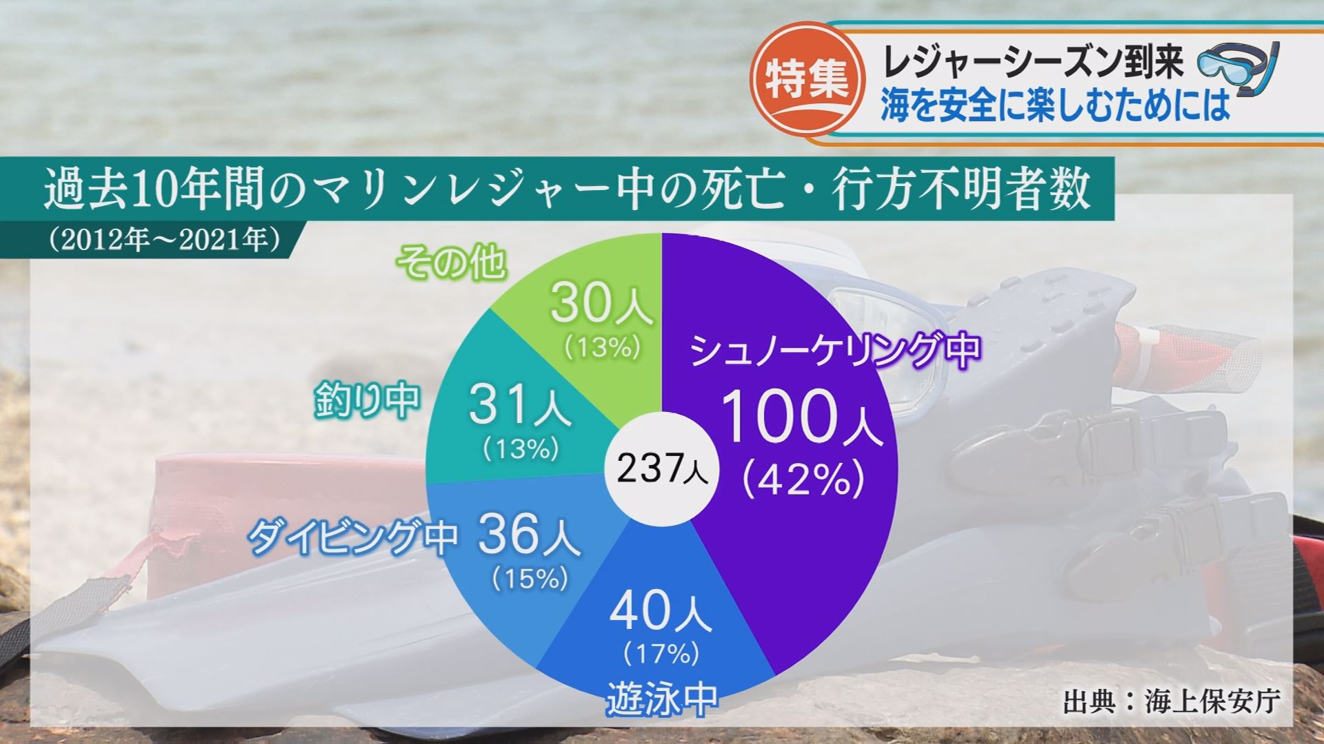 今年に入って沖縄県内で発生したマリンレジャー中の事故で死亡または行方不明の数は13人。そのうち4人がシュノーケリング中の事故です。過去10年間では死亡または行方不明の数は237人で、そのうちシュノーケリング中は100人、およそ4割にのぼります。