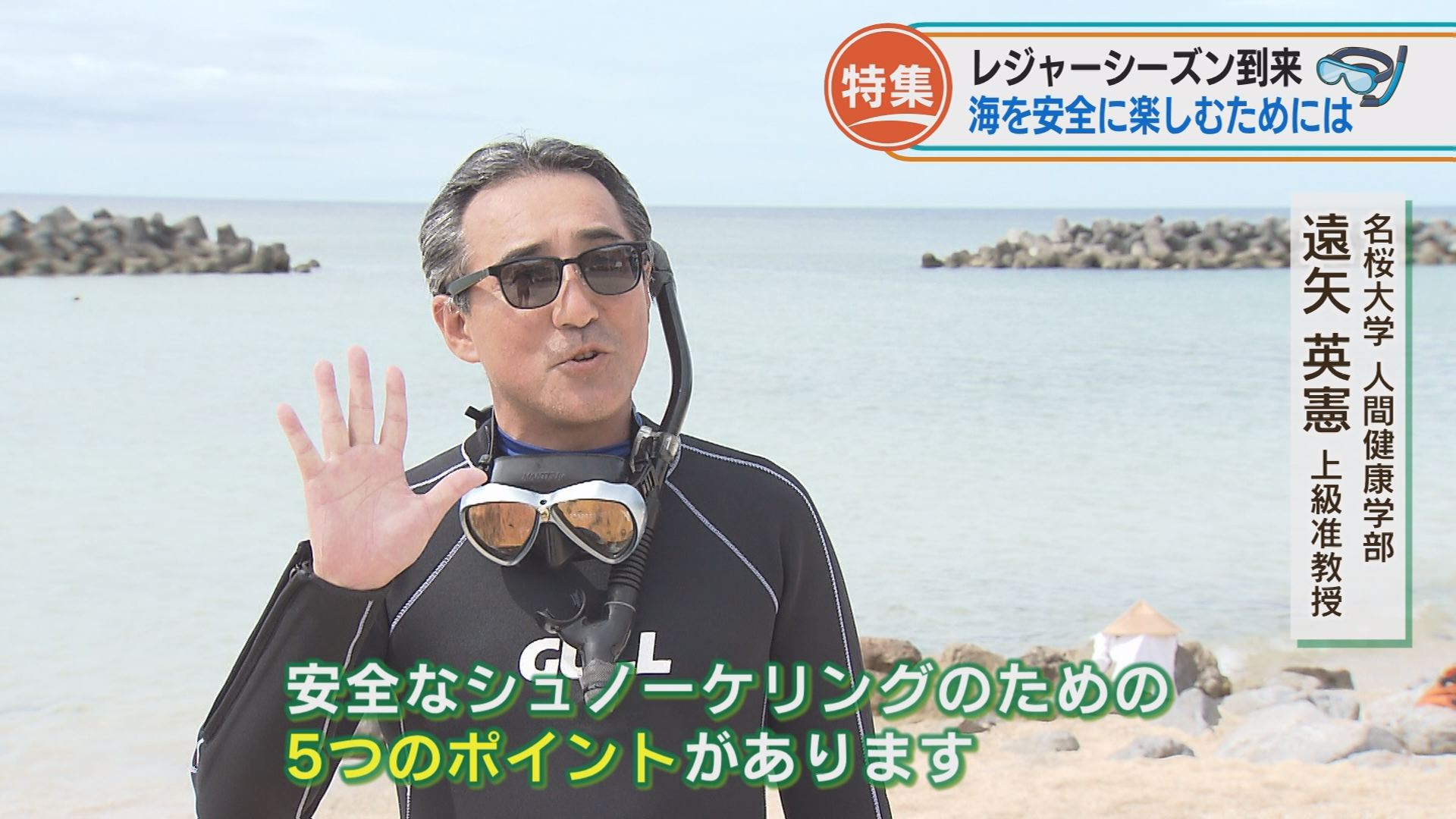 名桜大学の遠矢英憲上級准教授はシュノーケリング中の事故の多くは正しい知識を知らないことが原因だとします。そこで「正しい知識」とは何なのか、シュノーケリング実習に参加し、専門家から安全にシュノーケリングを楽しむ方法を教えてもらいました。