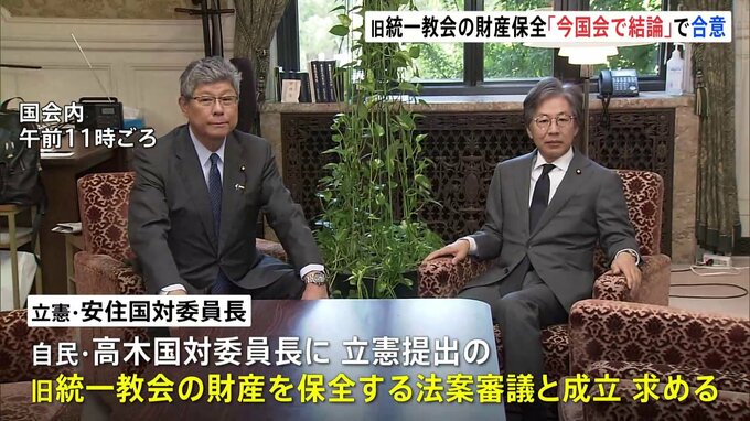 自民党と立憲民主党の国会対策委員長が会談し、旧統一教会の財産保全について与野党が法案を提出し、今の国会で審議する方針で合意しました。会談で立憲民主党の安住国対委員長は、自民党の高木国対委員長に対し、…