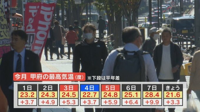 今月1日以降の甲府の最高気温はすべて20度を超え、平年を3度から9度上回っています。