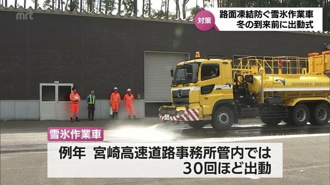 本格的な冬の到来に備えた取り組みです。高速道路の路面凍結を防ぐ「雪氷作業車」の出動式が宮崎市でありました。「雪氷作業車」は、気温が下がる前に塩分を含んだ凍結防止剤を道路に散布し、路面の凍結を防ぐもの…