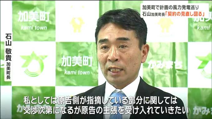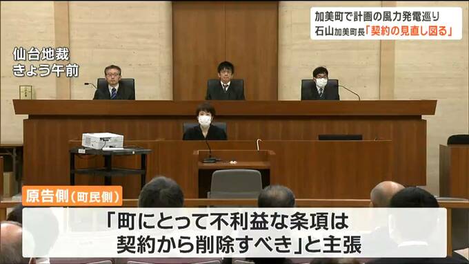 宮城県加美町に建設中の風力発電施設を巡り、事業者に土地を使用させないことなどを求めて町民が町長を提訴している問題についてです。8日開かれた第一回の口頭弁論を受け、石山敬貴町長は契約の見直しを図る方針を示しました。