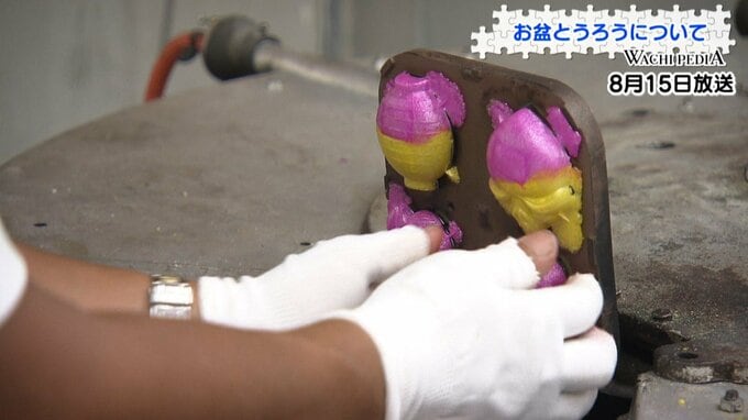 原材料はコーンスターチともち米と着色料など。これらを混ぜたものを型で焼き、できあがった「とうろう」を同じ型同士、紙製の紐をつけ貼り合わせたて完成です。