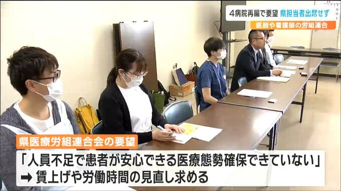 また、看護師の労働環境悪化につながるとして4病院再編構想の撤回も求めましたが、県は今回の主要な項目ではないとして、4病院再編の担当部署の職員は出席しませんでした。