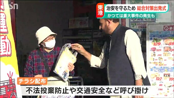 さっそく、近くの商業施設でチラシを配布。東港周辺の事業者らも加わり不法投棄防止や交通安全などを呼び掛けました。