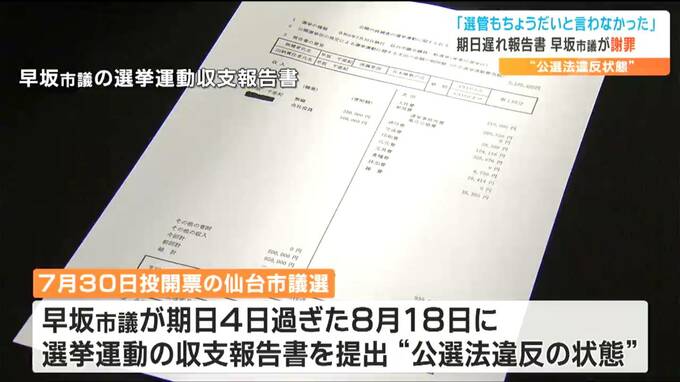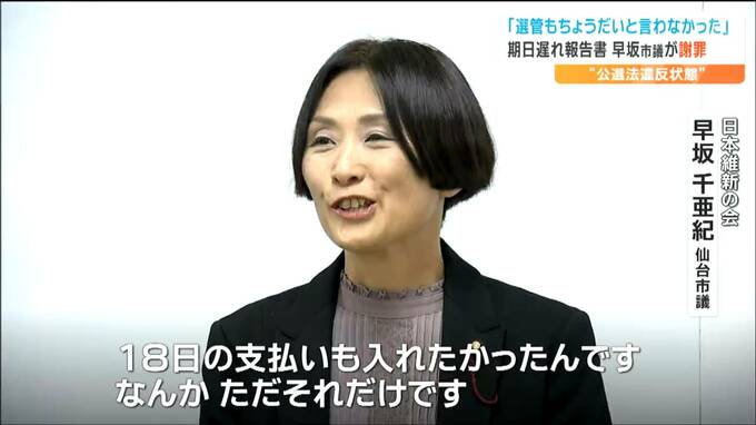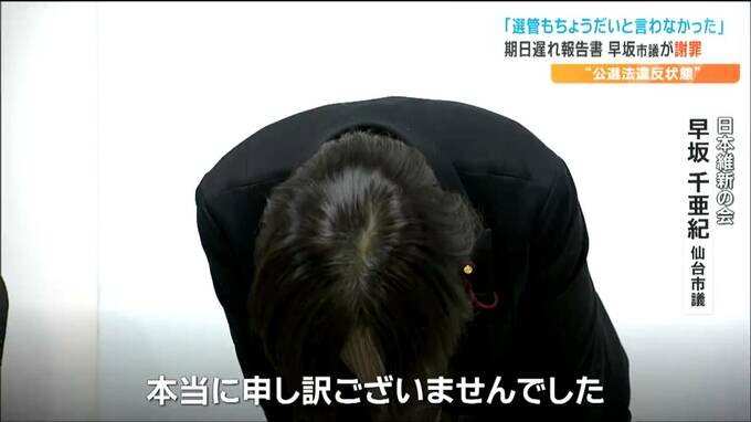 日本維新の会の早坂千亜紀仙台市議が期日を過ぎて選挙運動の収支報告書を提出し法令違反の状態となっている問題で早坂市議が9日、謝罪しました。