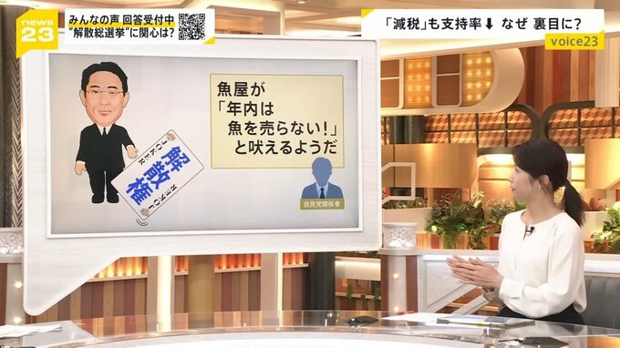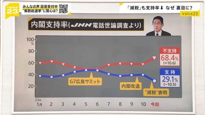 5月のG7広島サミットで少し回復した支持率は、最新の調査(11月)でさらに下がって29.1%と過去最低になりました。最後の1か月で、減税表明からぐっと下がりましたね。