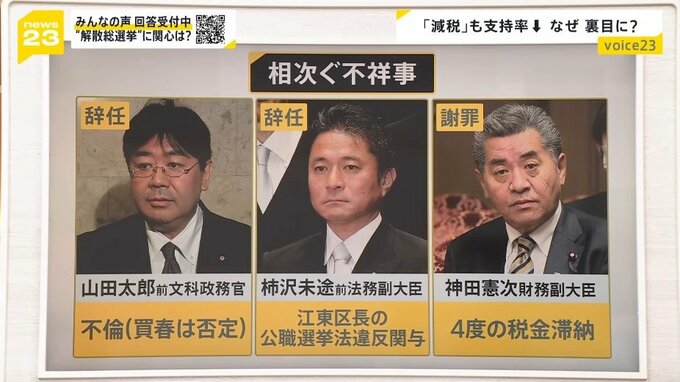表明したうえに、ああ、やばいと。減税をまた発表する。行ったり来たりしてるようにも見えるんです。そして内閣改造をやった後も、選挙法違反とか税金の問題とか…本人じゃないんですけど、本人が統率してるはずの自民党の中で複数のスキャンダルも出てきてる、不祥事も発覚しています。