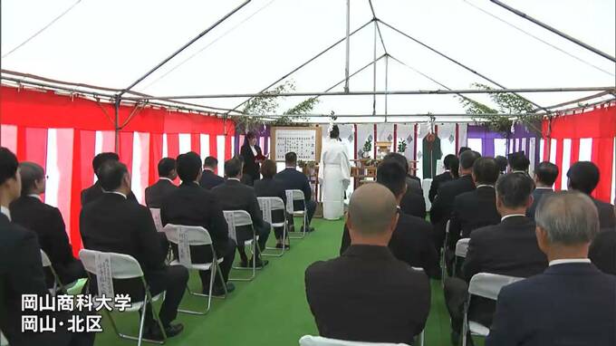起工式には関係者約30人が参加し、工事の安全を願いました。岡山商科大学の創立60周年を記念した新校舎棟は、建設のために取り壊した校舎の跡地に造られます。