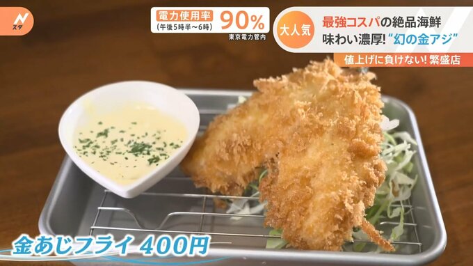 そんな幻のアジ。特に皆さんが注文していたのは、「金あじフライ」1枚400円。金アジは1kgで約2500円で取引されることもある絶品のアジ。それが1枚400円とは、いかにお得なのかが分かります。