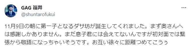 10日、お笑いトリオ「GAG」の福井俊太郎さんが自身のX(旧ツイッター)を更新し、第一子が誕生したことを明かしました。