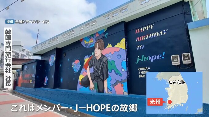 「これ光州。ソウルから新幹線で2時間半ぐらいのところなんですけど、これ、メンバー・J-HOPEの故郷なんです。ファンの人がお金を出し合って家の壁に壁画みたいのを描いて。『ここに行ってみたい』『写真撮りたい』と」