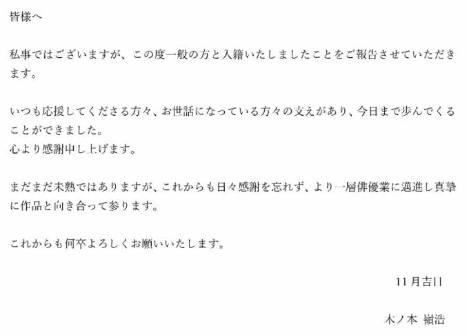 木ノ本さんは所属事務所の公式サイトに掲載した文面をXにも投稿し「私事ではございますが、この度一般の方と入籍いたしましたことをご報告させていただきます。」と知らせました。