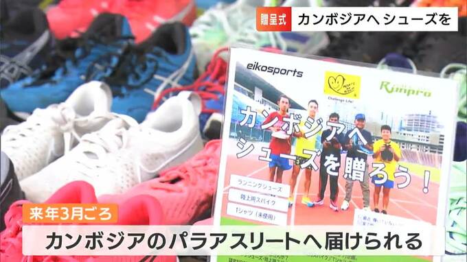 岡山市のスポーツ用品店「栄光スポーツ」に客から寄せられたランニングシューズ200足以上などが有森さんに託されました。有森さんが代表を務めるNPO法人「ハート・オブ・ゴールド」は、カンボジアの子どもや障害者のスポーツ支援を行っています。シューズは来年3月頃、カンボジアのパラアスリートに届けられるということです。