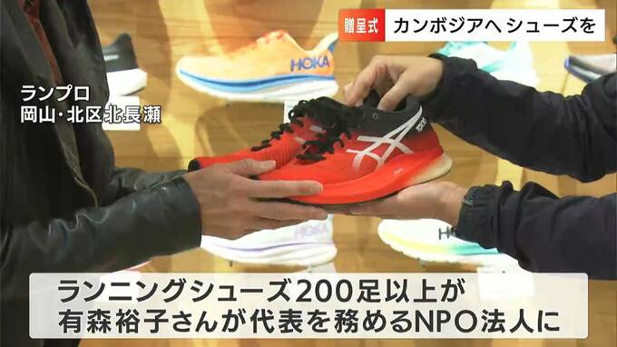 今月(11月)12日に開催される「おかやまマラソン2023」スペシャルアンバサダーを務める有森裕子さんが代表を務めるNPO法人に、カンボジアに届けるためのランニングシューズが贈られました。