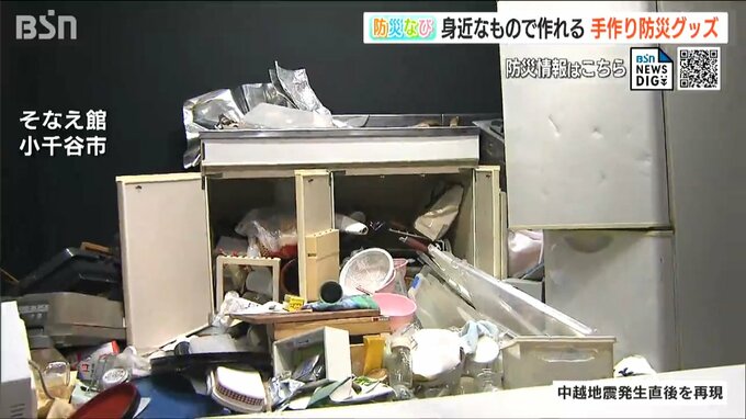 実際に、2004年の中越地震発生直後のある家庭のキッチンを再現したものを見てみると、物が散乱していて歩くスペースもありません。