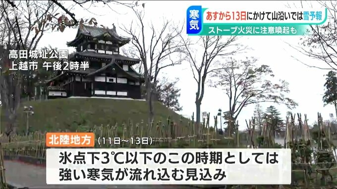 新潟地方気象台によりますと北陸地方には、11日から13日にかけて氷点下3度以下の、この時期としては強い寒気が流れ込む見込みで、