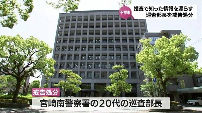 宮崎県警察本部は、宮崎南警察署の20代の巡査部長が、捜査で知った情報を知人に漏らしたとして、戒告処分としました。警察によりますと戒告処分を受けた宮崎南警察署の20代の巡査部長は、2021年7月、捜査の過程で…